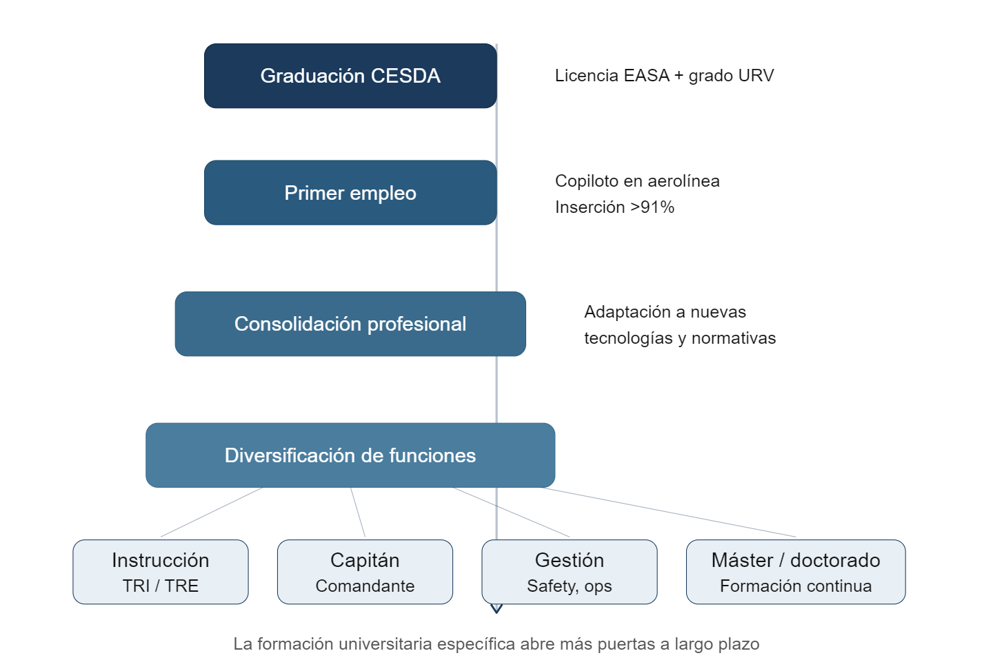 - Grado universitario en Piloto Comercial (CESDA) — formación universitaria oficial que integra instrucción de vuelo y preparación académica en un único itinerario de cuatro años, con título de grado de la URV y licencia EASA.